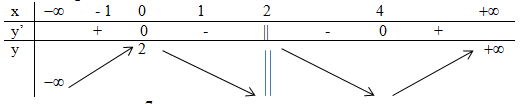 \(\begin{array}{l}D = R\backslash \{ 2\} \\\mathop {\lim }\limits_{x \to  + \infty } y = \mathop {\lim }\limits_{x \to  – \infty } y = 0,\\ \mathop {\lim }\limits_{x \to {2^ + }} y =  + \infty ,\,\mathop {\lim }\limits_{x \to {2^ – }} y =  – \infty \end{array}\)