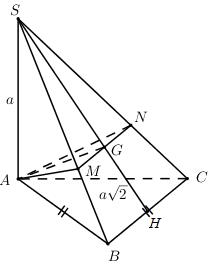 Lại có \({S_{AMN}} = \dfrac{1}{2}d\left( {N;AM} \right).AM\)\( = \dfrac{1}{2}.\dfrac{1}{2}d\left( {B;SA} \right).\dfrac{1}{2}SA = \dfrac{1}{4}{S_{SAB}}\)