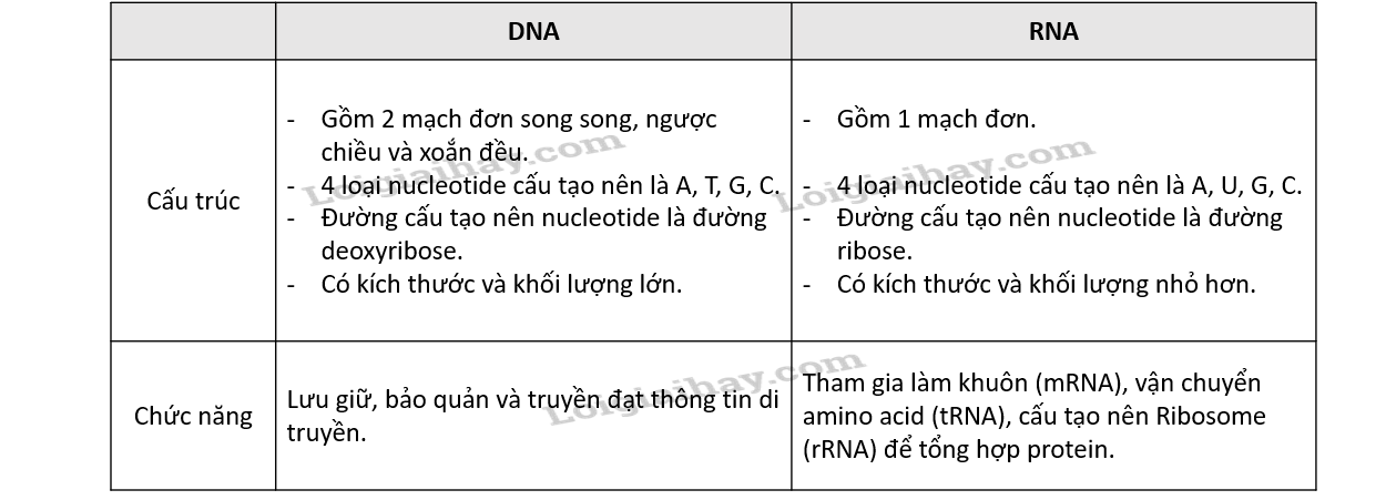 Dựa vào các đặc điểm cấu tạo và vai trò của 2 loại phân tử nucleic acid: DNA và RNA để so sánh những điểm chính.
