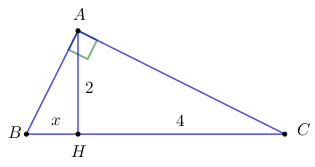 Cho tam giác ABC vuông tại A, đường cao AH. Biết AH = 2, HC = 4. Đặt BH = x. Tính x.