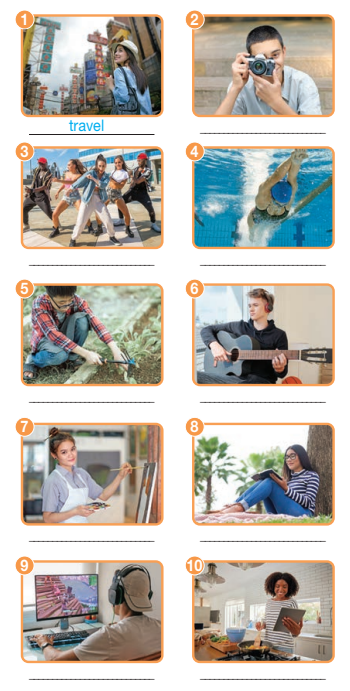 1. Label the pictures. Use the words from the list. Then listen and check. 2. What are your hobbies? Talk with your friend. 3. Put the food/drinks in the list under the categories. Then listen and check. 4. Which of the food/drinks in Exercise 3 do you usually have for breakfast, lunch or dinner? 5. Use the verbs in the list and the verbs in brackets to complete the sentences. 6. What do you like / love / hate doing in your free time? 7. Circle the correct option. 8. Fill in each gap with how m