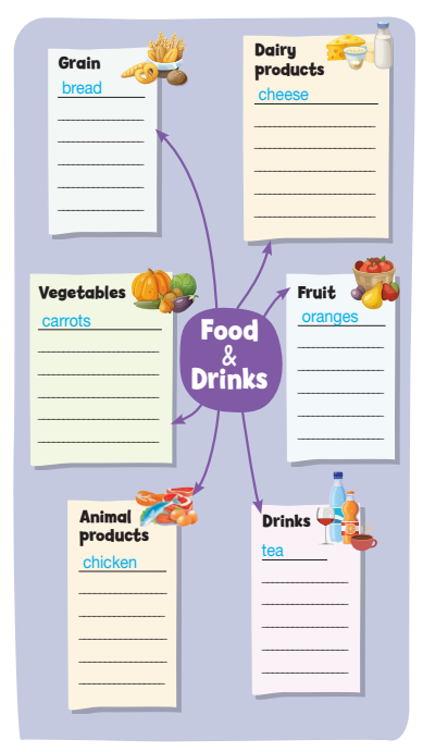 3. Put the food/drinks in the list under the categories. Then listen and check.