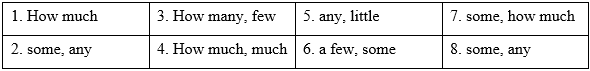 (Điền vào mỗi chỗ trống với how much, how many, some, any, a lot of, few, a few, little hoặc a little.)