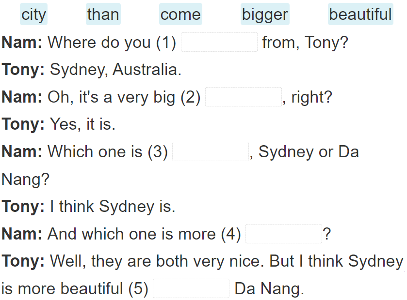 Tony: Well, they are both very nice. But I think Sydney is more beautiful (5) than Da Nang.