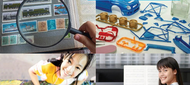 In the picture, I can see 4 hobbies: painting, playing the piano, collecting stamps, assembling. Some popular hobbies in my country are reading, listening to music, and playing soccer.