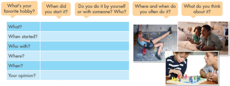 (Bây giờ, chọn sở thích yêu thích của bạn. Làm việc theo cặp: Sử dụng các câu hỏi để thảo luận về các điểm trong bảng dưới đây và viết ra ý kiến của riêng bạn.)