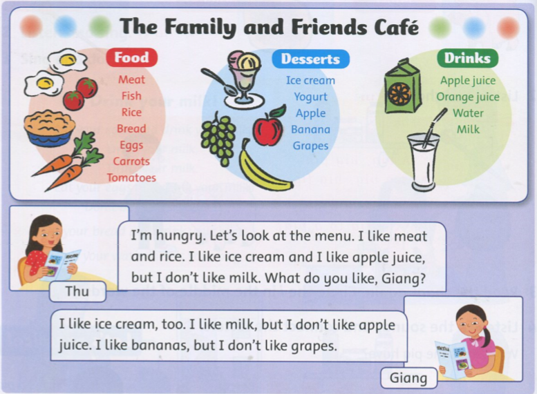 Thu: I’m hungry. Let’s look at the menu. I like meat and rice. I like ice cream and I like apple jiuce, but I don’t like milk. What do you like, Giang?