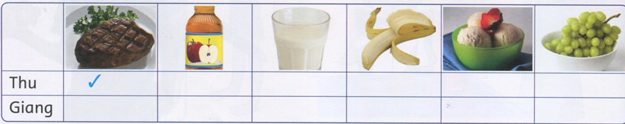 Giang: I like ice cream, too. I like milk, but I don’t like apple juice. I like bananas, but I don’t like grapes.