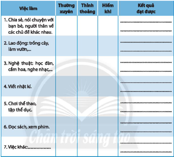 Đánh dấu X vào mức độ phù hợp với những việc em đã thực hiện để tạo niềm vui và sự thư giãn. Viết kết quả đạt được sau khi thực hiện những việc làm này.
