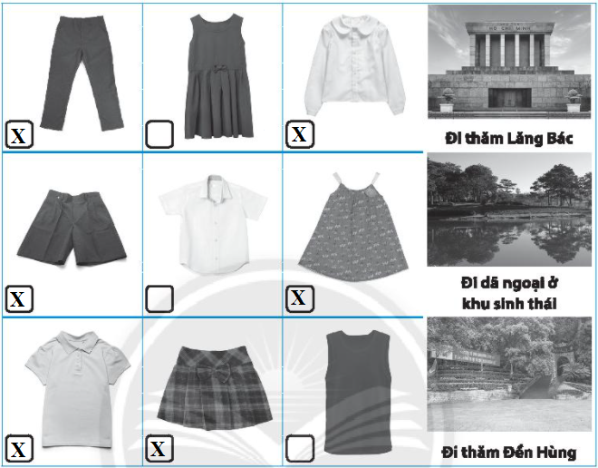 Đánh dấu X vào dưới trang phục phù hợp khi đến các địa điểm sau. Chia sẻ cảm xúc của em khi mặc trang phục phù hợp với nơi mình đến.