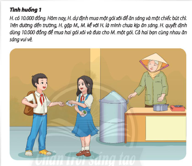 –   Tình huống 1: H đã xác định khoản chi tiêu là 10.000 đồng mua một gói xôi và một bút chì. Nếu em là H em có thể chia nửa gói xôi của mình cho bạn và vẫn mua chiếc bút chì.