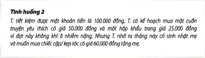–   Tình huống 2: Nếu em là T em sẽ chọn mua kẹp tóc cho mẹ và mua hộp khẩu trang trước vì đó là những đồ dùng cần thiết ngay hiện tại.