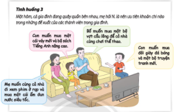 –   Tình huống 3: Nếu em là N em sẽ ưu tiên cho khoản chi tiêu mua bộ sách tiếng anh nâng cao cho em gái. Vì đó là đồ dùng cần thiết trong học tập của em.