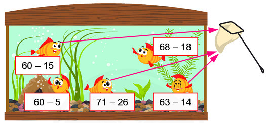 Tính hiệu của hai số ở mỗi chú cá, hiệu nào bé hơn 50 thì ta vớt con cá đó ra.