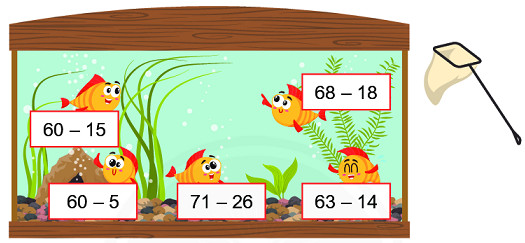 Tính hiệu của hai số ở mỗi chú cá, hiệu nào bé hơn 50 thì ta vớt con cá đó ra.