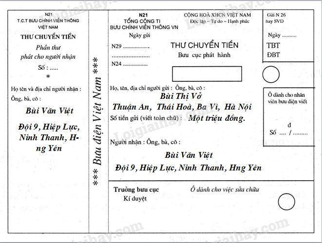 Em cùng mẹ ra bưu điện gửi tiền về quê biếu bà. Hãy giúp mẹ điền những điều cần thiết vào mẫuThư chuyển tiền dưới đây: