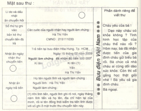 (Gợi ý: Em cần đọc mặt sau của thư chuyển tiền để trả lời đúng câu hỏi)