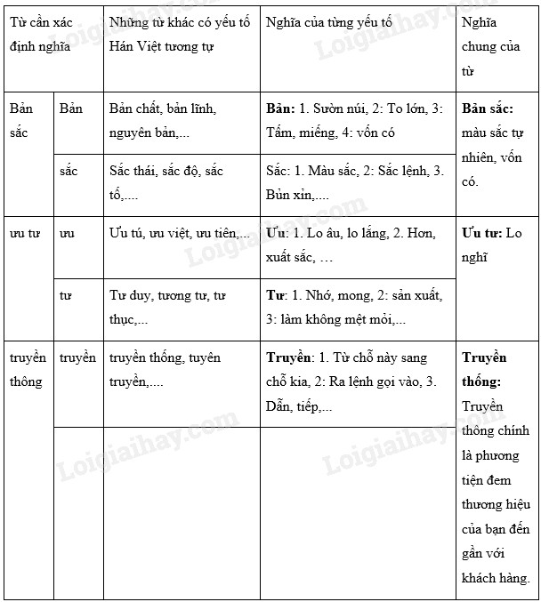 Bản sắc, ưu tú, truyền thông là các từ có yếu tố Hán Việt. Lập bảng theo mẫu được gợi ý sau đây để xác định nghĩa của chúng: