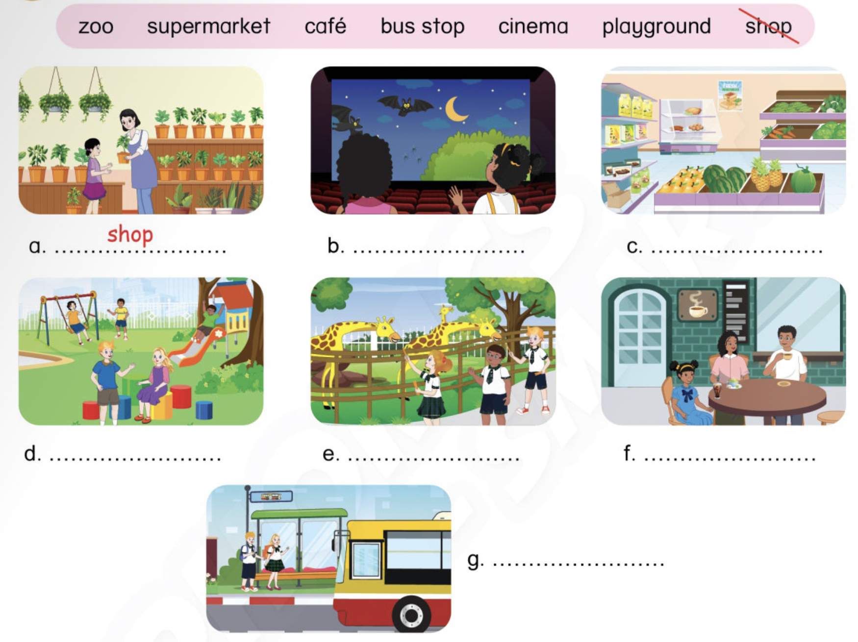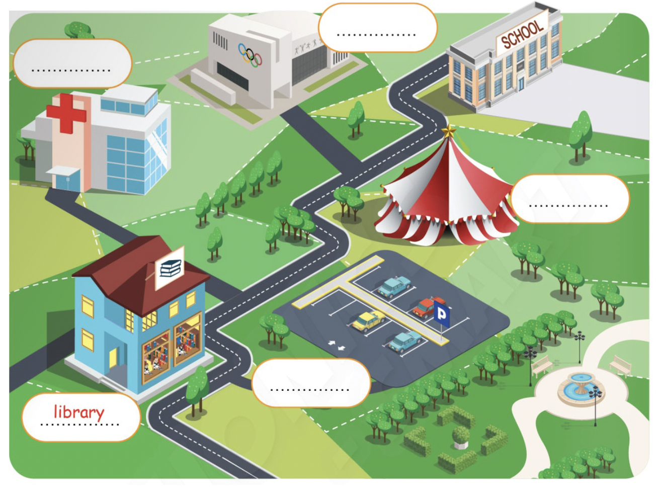a. Ngôi trường nằm giữa sân chơi và siêu thị.