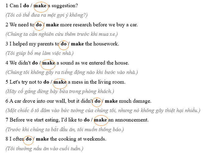 (Hoàn thành các câu với dạng đúng của do hoặc make.)