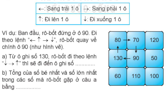 Quan sát các ô số, đi theo các lệnh của mũi tên rồi điền số thích hợp vào ô trống.