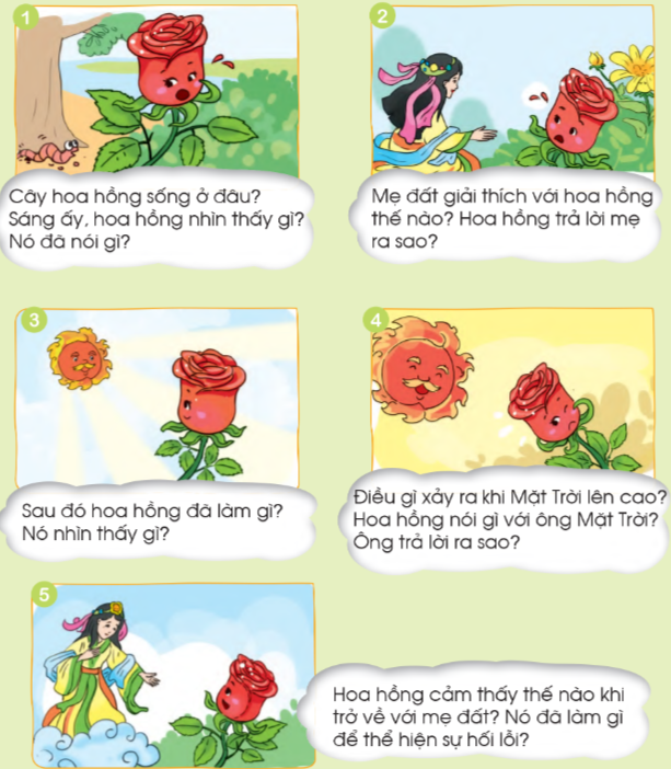 Tranh 5: Hoa hồng vội trèo xuống. Bộ rễ vừa tiếp đất, hoa hồng liền cảm thấy một dòng sữa ngọt lịm chạy khắp cơ thể khiến nó tỉnh táo hẳn. Nó hối hận xin lỗi mẹ đất, xin lỗi anh giun đất. Từ đó nó không bao giờ rời xa mẹ đất.