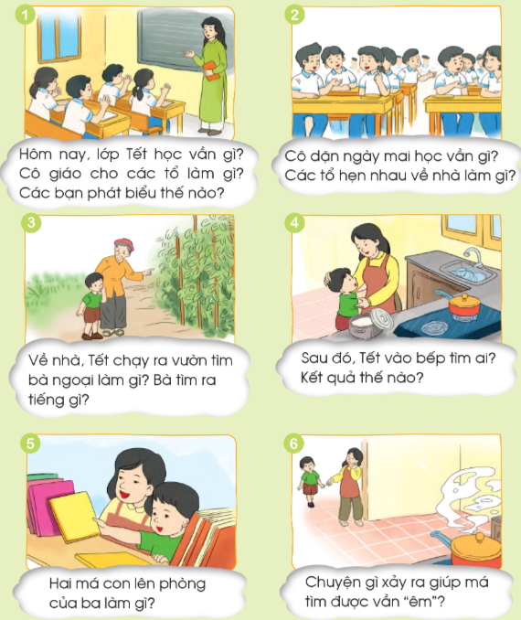 Tranh 2: Cô dặn các bạn học sinh ngày mai học vần êm. Các tổ về nhà hẹn nhau đi tìm những từ có vần “êm”