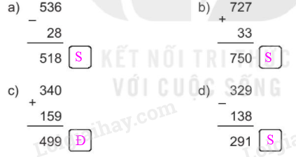 Đ, S? Khoanh vào chữ đặt trước câu trả lời đúng. a) Kết quả tính 356 + 320 – 280 bằng: A. 296 B. 395 C. 396 b) Kết quả tính 520 – 318 + 407 bằng: A. 609 B. 519 C. 619 Trường Hòa Bình có 425 học sinh. Trường Thành Công có ít hơn trường Hòa Bình 70 học sinh. Hỏi trường Thành Công có bao nhiêu học sinh?