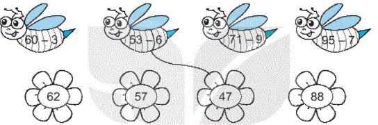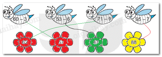 Đặt tính rồi tính (hoặc tính nhẩm) kết quả của phép trừ ghi trên mỗi con ong rồi nối với số tương ứng trên bông hoa.