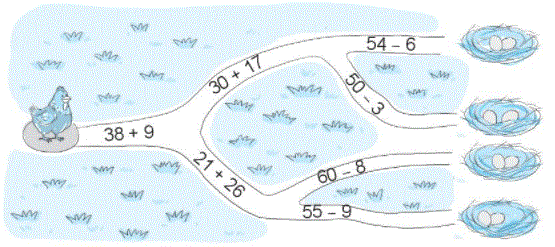 Tô màu con đường chứa ba phép tính có kết quả bằng nhau là: 38 + 9; 30 + 17 và 50 – 3.
