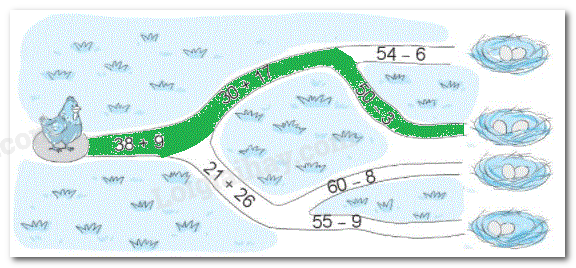 Đường đến ổ rơm của gà mái mơ đi qua ba phép tính có kết quả bằng nhau. Hãy tô màu con đường đi đến ổ rơm của gà mái mơ.