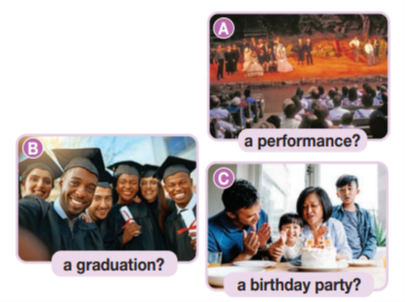 1. a) You are going to listen to a dialogue between two friends. Read the questions (1–3) and underline the key words. b) What do you think the dialogue is about? 2. Now listen to the dialogue. For questions (1–3), choose the best answer (A, B or C). 3. Read the questions (1–3). Which is about … 4. Think of words related to each event in Exercise 3 and make notes in your notebook. 5. Now listen to the dialogues. For questions (1–3), choose the best answer (A, B or C). 6. Look at the cartoon.