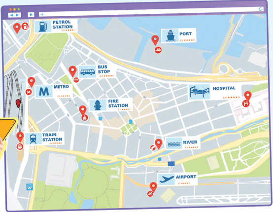 I can see the map on the Internet. I can see a petrol station, a hospital, a port, a bus stop, a metro, a fire station, a river, an airport and a train station.