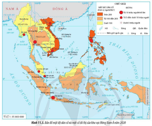 Quan sát hình 11.3, hãy đọc tên các nước có mật độ dân số trên 200 người/km2 và các đô thị có số dân từ 5 đến dưới 10 triệu người, từ 10 triệu người trở lên ở khu vực Đông Nam Á.