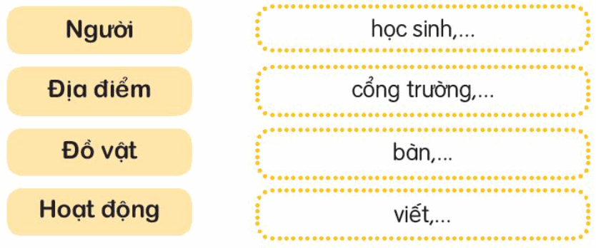 – Người: học sinh, cô giáo, thầy giáo, bác bảo vệ, thầy hiệu trưởng, cô lao công