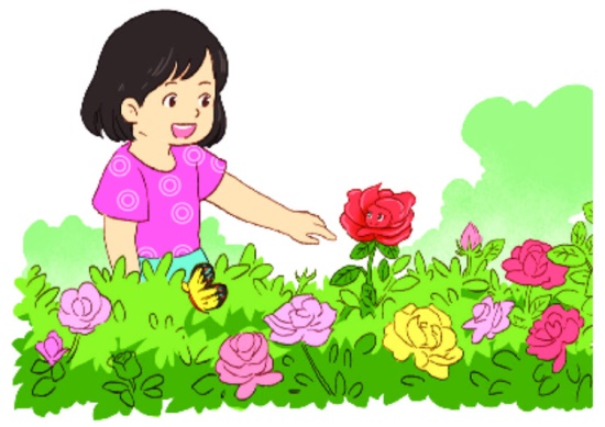 Buổi sáng, bước ra vườn hồng, nhìn thấy bông hồng đỏ thắm, bé vui sướng reo lên:
