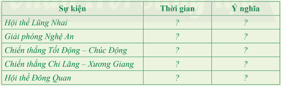 Em hãy xác định thời gian, ý nghĩa của những sự kiện tiêu biểu trong khởi nghĩa Lam Sơn theo bảng sau: