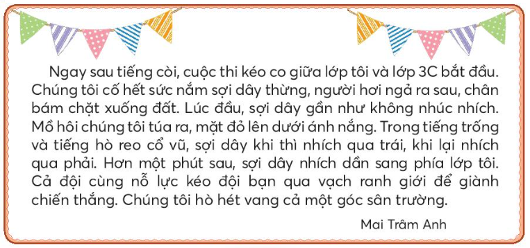 Chúng tôi cố hết sức nắm sợi dây thừng, người hơi ngả ra sau, chân bám chặt xuống đốt. Lúc đầu, sợi dây gần như không nhúc nhích. Trong tiếng trống và tiếng hò reo cổ vũ, sợi dây khi thì nhích qua trái, khi lại nhích qua phải. Hơn một phút sau, sợi dây nhích dồn sang phía lớp bạn nhỏ. Cả đội cùng nỗ lực kéo đội bạn qua vạch ranh giới để giành chiến thắng. Mọi người hò hét vang cả một góc sân trường.
