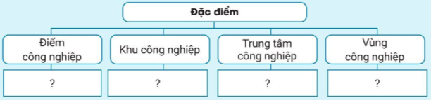 Hoàn thành sơ đồ theo mẫu sau để thể hiện đặc điểm của các hình thức tổ chức lãnh thổ công nghiệp.