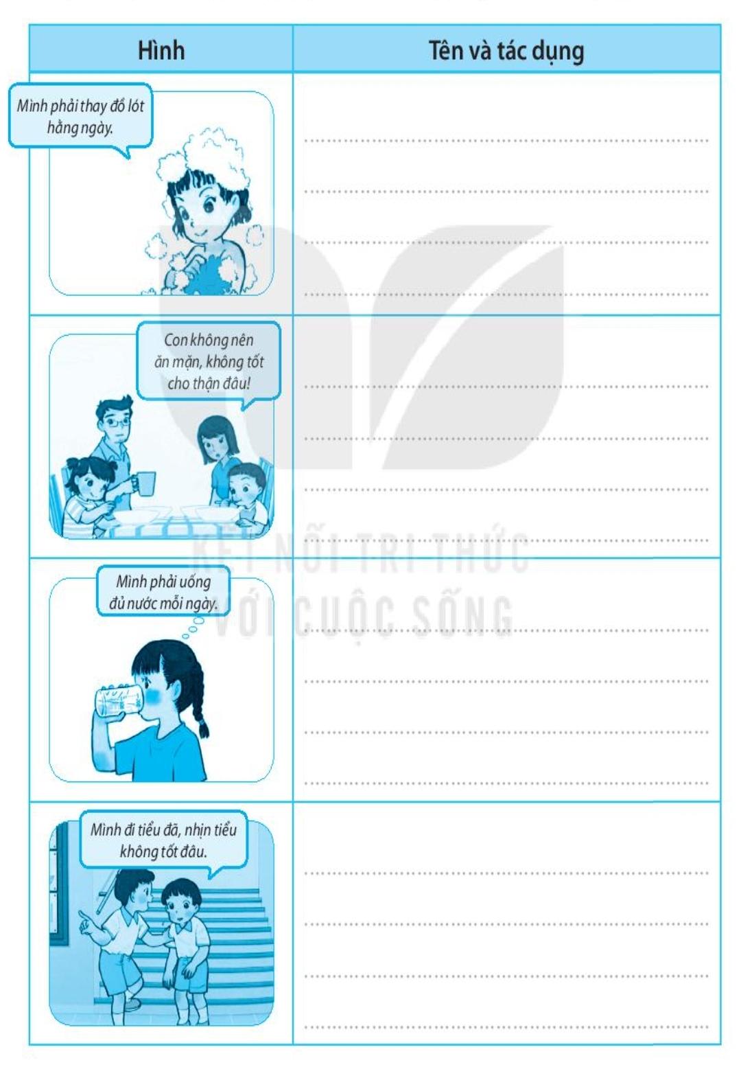 Viết vào chỗ (…) tên và tác dụng của các việc làm để chăm sóc, bảo vệ cơ quan bài tiết nước tiểu được thể hiện trong mỗi hình sau: