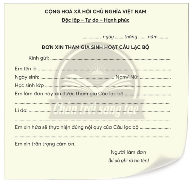 Hoàn thành Đơn xin tham gia sinh hoạt câu lạc bộ theo mẫu dưới đây: