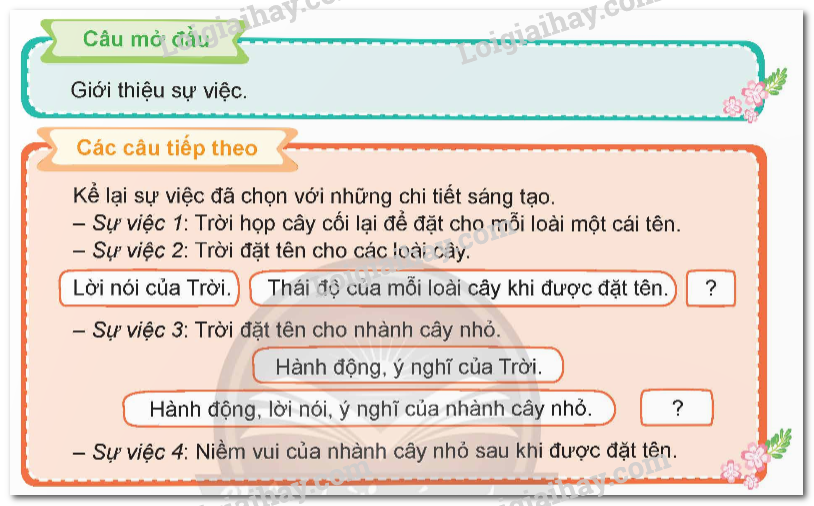 Cây có hương thơm dịu được Trời đặt tên là lan. Cây có điệu múa nhịp nhàng được đặt là tóc tiên. Loài cây có dáng đứng hiên ngang được gọi là thông. Các loại rau có cũng có mặt đông đủ để xin Trời những cái tên thật đẹp như quế, tía tô, húng,…