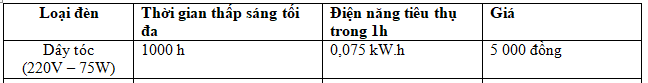 Dựa vào bảng số liệu về bóng đèn dây tóc, em hãy tính toàn bộ chi phí mua bóng đèn và tiền điện phải trả cho việc sử dụng bóng đèn dây tóc trên trong 1 năm. Cho biết giá điện là 1 500 đồng/kW.h và một năm có 365 ngày, mỗi ngày các đèn hoạt động 12h.