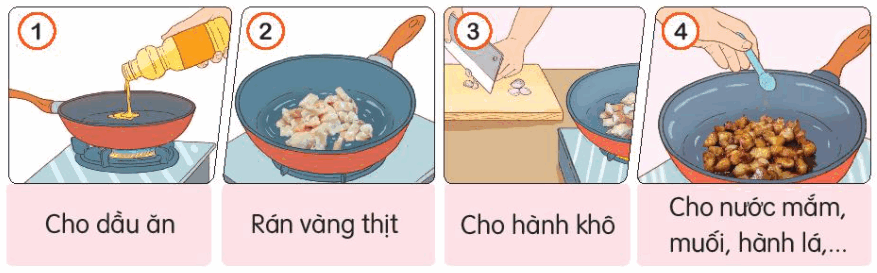 Em quan sát kĩ các bức tranh và trao đổi với các bạn về các bước làm món thịt rang.