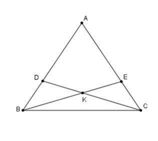 Cho tam giác \(ABC\) có \(AB = AC.\) Trên các cạnh \(AB\) và \(AC\) lấy các điểm \(D,E\) sao cho \(AD = AE.\) Gọi \(K\) là giao điểm của \(BE\) và \(CD\). Chọn câu sai.