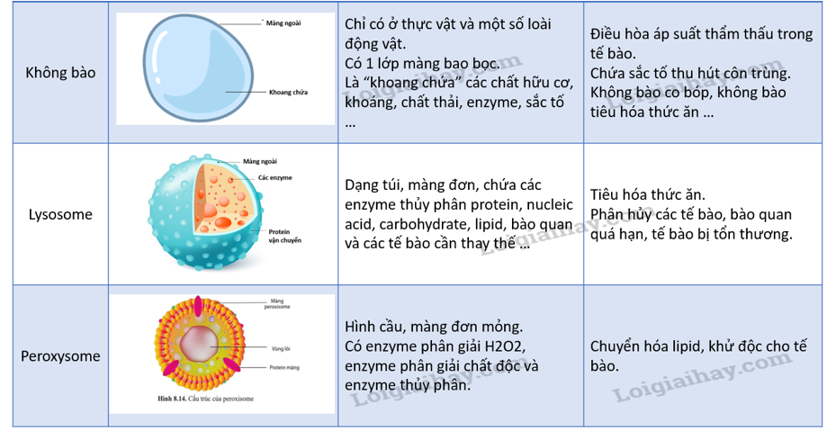 Để có cái nhìn bao quát hơn về cấu tạo và vai trò của các bào quan, em hãy quan sát bảng dưới đây:
