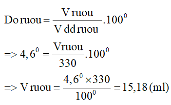 Câu 6: Trên vỏ lon bia Tiger 330 ml có ghi độ cồn ( độ rượu) là 4,60. Vậy thể tích rượu etylic có trong 330 ml bia trên là