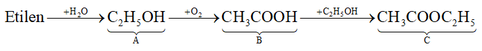 Câu 9: Có sơ đồ phản ứng sau: \(Etilen\xrightarrow{+{{H}_{2}}O}A\xrightarrow{+{{O}_{2}}}B\xrightarrow{+{{C}_{2}}{{H}_{5}}OH}C\).