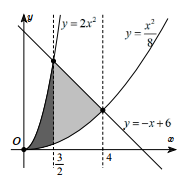 \(\begin{array}{l}2{x^2} = \frac{{{x^2}}}{8} \Leftrightarrow x = 0\\2{x^2} = – x + 6 \Leftrightarrow x = \frac{3}{2}\,\,\left( {x \ge 0} \right)\\\frac{{{x^2}}}{8} = – x + 6 \Leftrightarrow x = 4\,\,\left( {x \ge 0} \right)\end{array}\)