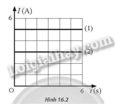 Hai dòng điện không đổi (1) và (2) có đồ thị biểu diễn sự phụ thuộc của cường độ dòng điện theo thời gian như Hình 16.2.
